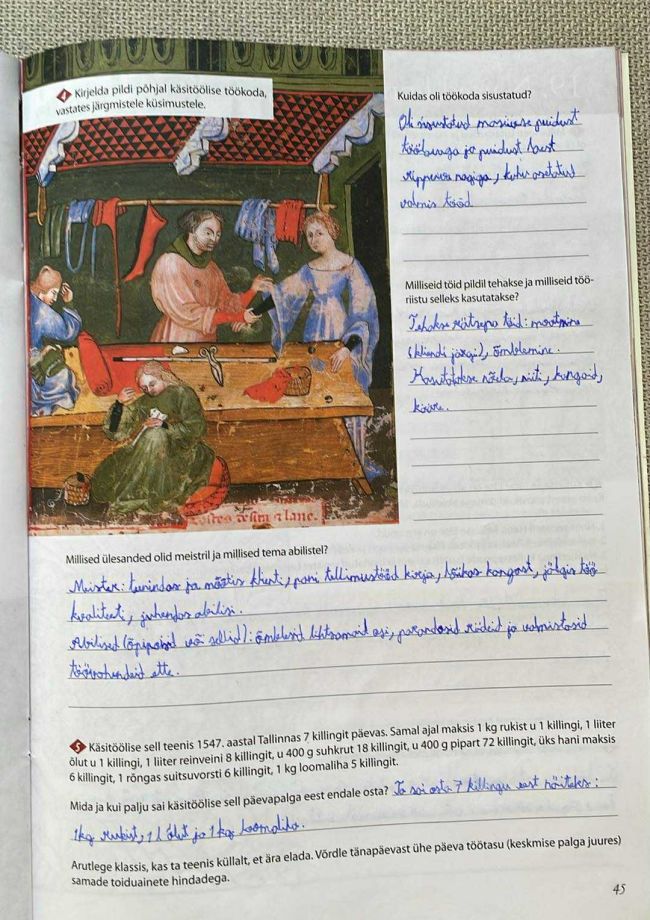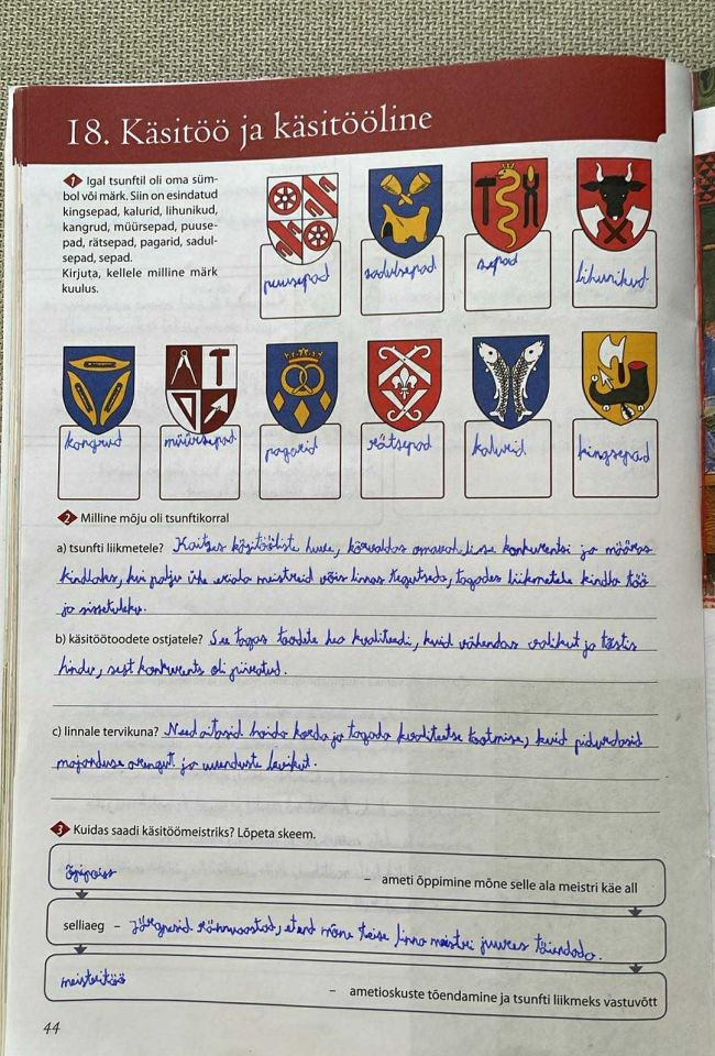 Tutvusime õpiku teemaga "Käsitöö ja käsitööline". Robin sai teada, et keskaja linn oli nagu suur töökoda, kus tänavad olid täis erinevate meistrite töökojasid ja ametid paiknesid sageli eraldi linnaosades. Käsitöö erialasid oli palju ning ametite väärtus sõltus materjalist ja oskuste keerukusest – näiteks kullassepad olid eriti lugupeetud.