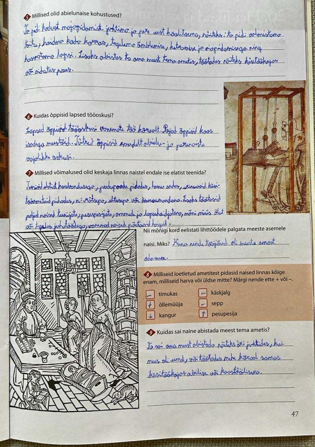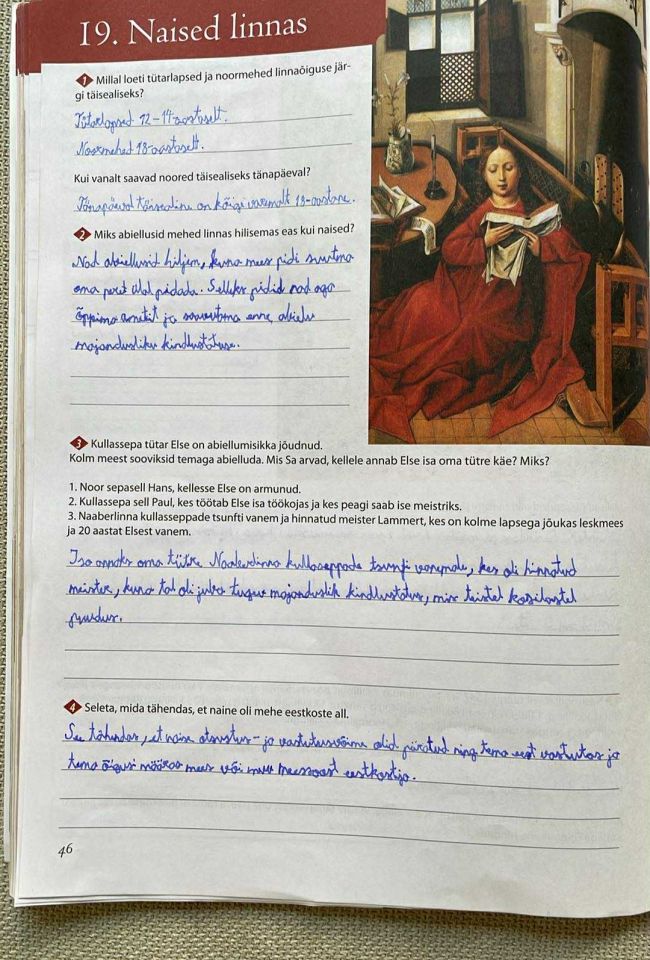 Tutvusime õpiku teemaga "Naised linnas". Robin sai teada, et keskajal oli naise peamine eesmärk soodsalt abielluda ning tal oli kodus ja linnaelus palju kohustusi. Abielluti enamasti vanemate tahtel ja naise rolliks oli olla majaperenaine, ema ning mehe abiline tema ametis. Koduses majapidamises vastutas naine toiduvalmistamise, käsitöö, puhtuse ja laste kasvatamise eest; jõukamates peredes juhtis ta teenijate tööd.