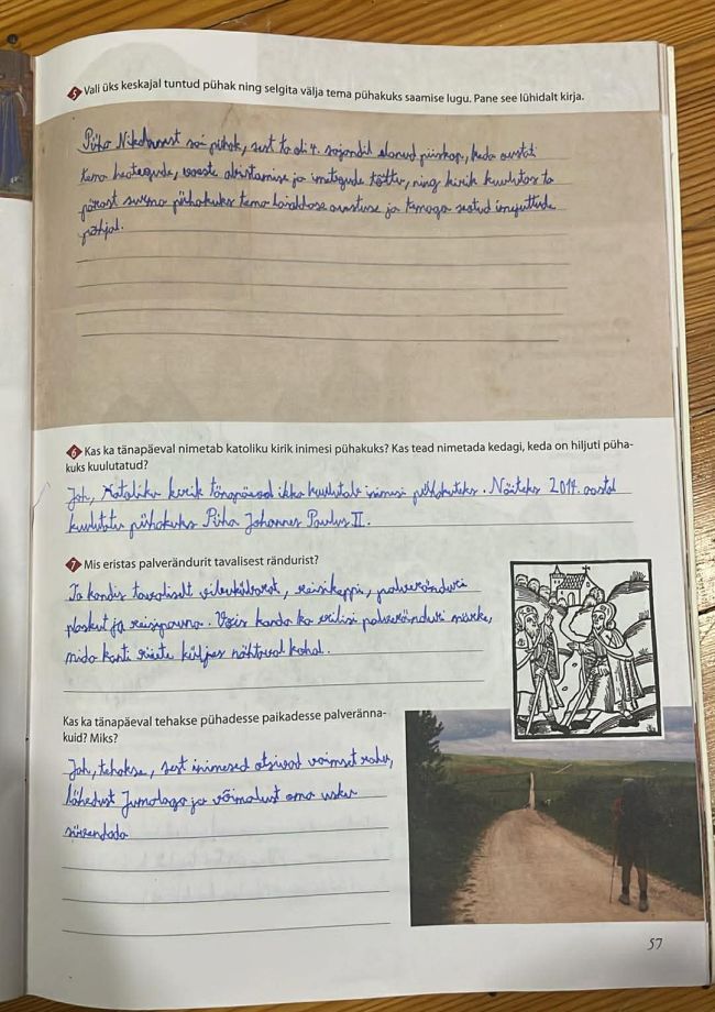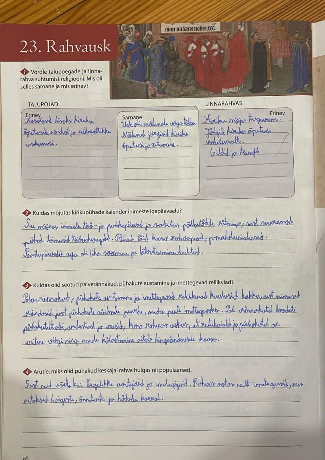 Tutvusime õpiku teemaga „Rahvausk“. Robin sai teada, et keskajal oli usk inimeste elus väga tähtis ja kirik mõjutas kogu elu – tööd, pühi ja isegi abielu. Talupoegadel olid lisaks kiriku õpetustele säilinud vanad rahvauskumused ja külanõiad, linnas aga järgiti usku rangemalt. Kirikupühad tõid rõõmu ja pidusid, kuid vahepeal tuli ka paastuda. Suurt tähtsust omasid pühakud ja nende säilmed, kellelt loodeti imesid. Paljud inimesed käisid palverännakutel, et saada pattudele andestust ja tagada endale parem tulevik.