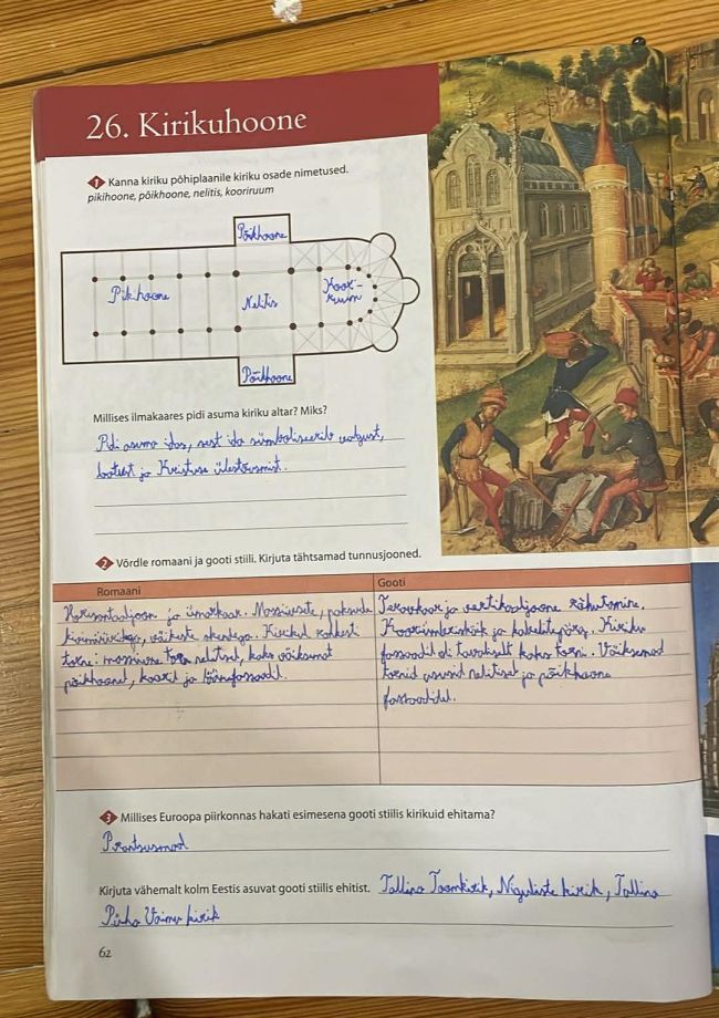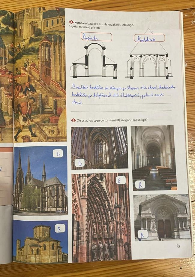 Tutvusime õpiku teemaga "Kirikuhoone". Robin sai teada, et kirik oli keskajal nii pühakoda kui ka küla ja kihelkonna tähtsaim kooskäimiskoht, mis pakkus inimestele palve- ja pelgupaika ning peavarju ka sõja ajal ja palveränduritele. Kirikud ehitati ida-lääne suunas nii, et altar asus idas – hommiku ja ülestõusmise poole –, ning nende rajamine oli inimeste jaoks usutegu, mille nimel panustasid nii rikkad kui vaesed. Keskajal kujunesid välja kaks peamist stiili: raskepärane romaani stiil paksude müüride ja ümarkaartega ning kõrgusesse pürgiv gooti stiil teravkaarte, saledate tornide ja suurte vitraažakendega, mille värviline valgus pidi sümboliseerima Jumala ligiolekut. Kirikuhooneid kaunistati lisaks vitraažidele ka skulptuuridega, mis kujutasid piiblitegelasi ja pühakuid.