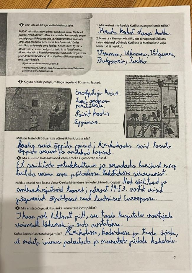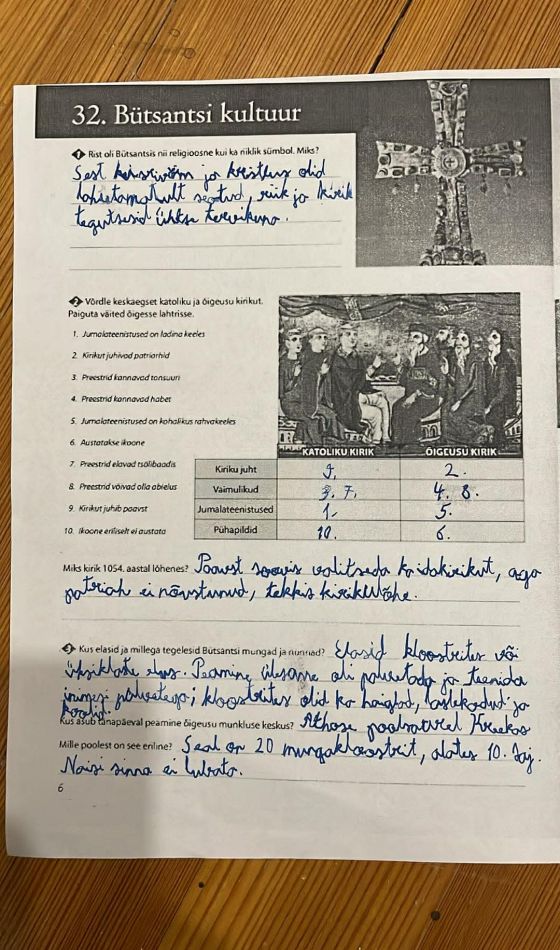 Tutvusime õpiku teemaga „Bütsantsi kultuur“. Robin sai teada, et Bütsantsis olid riik ja kirik väga tihedalt seotud ning sealt kujunes välja õigeusu kirik. Aastal 1054 eraldus see lõplikult katoliku kirikust. Bütsants levitas ristiusku slaavlaste hulgas ja lõi neile oma tähestiku. Oluline roll oli munkadel ja kloostritel, näiteks Athose poolsaarel.