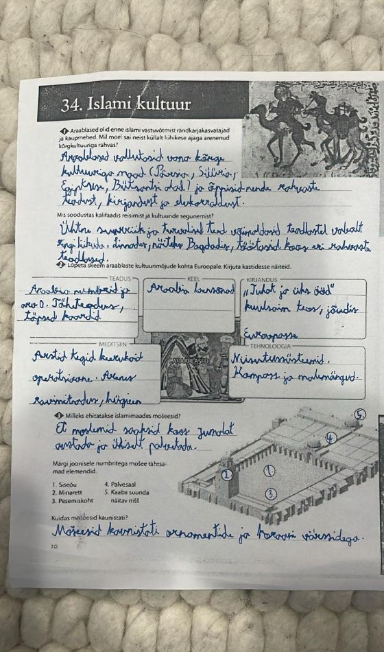 Tutvusime õpiku teemaga „Islami kultuur“. Robin sai teada, et araablased vallutasid mitmeid kõrge kultuuriga maid ja võtsid vallutatud rahvastelt üle teadmisi teaduse, kirjanduse ja eluviisi korraldamise kohta ning lõid eri kultuuridest ühtse islami kõrgkultuuri. Kaliifide toetusel arenesid linnades haridus, raamatukogud ja teadus ning islami maailmast sai sajanditeks maailma üks juhtivaid kultuurikeskusi. Pürenee poolsaarel puutusid islami ja kristlik kultuur eriti tihedalt kokku ning just sealt levisid araablaste teaduslikud ja tehnilised saavutused Euroopasse. Islamimaade arhitektuuris olid tähtsal kohal mošeed ja uhked paleed, mida kaunistasid ornamendid ja koraani värsid. Islami kirjakultuuri aluseks oli koraan ning olulist rolli mängisid ka Muhamedi õpetussõnad, mis mõjutasid igapäevaelu ja seadusi. Araablased andsid suure panuse astronoomia, matemaatika, geograafia ja eriti arstiteaduse arengusse ning nende saavutused mõjutasid Euroopa arengut veel sajandeid hiljem.