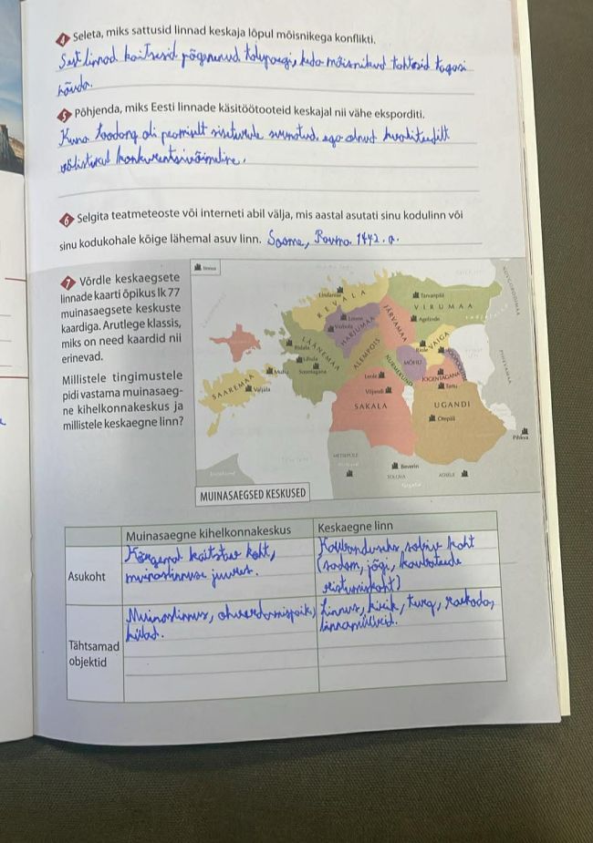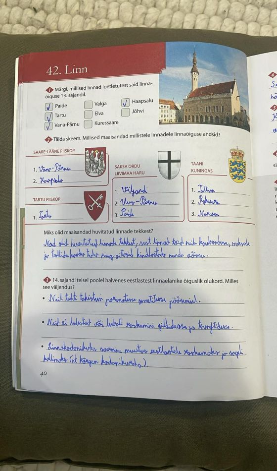 Tutvusime õpiku teemaga „Linn“. Robin sai teada, et keskaja linnad tekkisid Eestis pärast 13. sajandi vallutusi, kui maaisandad rajasid linnu endiste muinaslinnuste ja kaubanduseks soodsate paikade juurde. Linnadele anti linnaõigus ning neid juhtis raad, kuhu kuulusid peamiselt jõukad hansakaupmehed. Eestis oli keskajal üheksa linna ja lisaks hulk väiksemaid turuasulaid. Linnad olid kaubanduse ja käsitöö keskused, eriti tähtis roll oli Hansa Liidul, kuhu kuulusid näiteks Tallinn, Tartu ja Uus-Pärnu. Linnaelanikud olid eri rahvustest, kuid aja jooksul halvenes põliselanike seisund ning tekkisid pinged linnade ja aadli vahel, eriti seoses talupoegade linna põgenemisega.