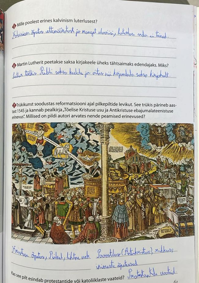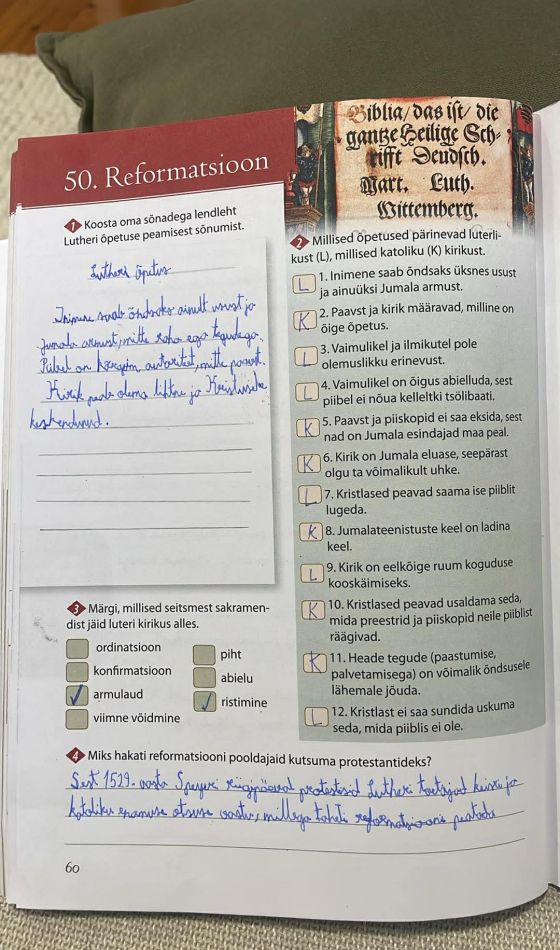 Tutvusime õpiku teemaga „Reformatsioon“. Robin sai teada, et reformatsioon sai alguse Martin Lutheri kriitikast katoliku kiriku vastu, eriti indulgentsidega kauplemise pärast, mida ta pidas inimeste eksitamiseks ja rahaahnuseks. Luther rõhutas, et inimene saab õndsaks üksnes usu kaudu ja Jumala armust, mitte heade tegude või raha eest, ning pidas piiblit ainsaks vaieldamatuks autoriteediks. Tema 95 teesi levisid kiiresti tänu trükikunstile ja said palju toetajaid, kuid tõid kaasa ka konflikti paavsti ja keisriga. Luther kuulutati lindpriiks, kuid ta leidis kaitset ning tema õpetus levis edasi, tuues kaasa kiriku ümberkorraldamise, uued jumalateenistuse vormid ja usu lõhenemise Euroopas. Reformatsioon levis ka teistesse maadesse, kujunedes luterlikuks, kalvinistlikuks ja anglikaani kirikuks ning põhjustades nii usulisi kui ka ühiskondlikke pingeid, sealhulgas talurahvasõda Saksamaal.