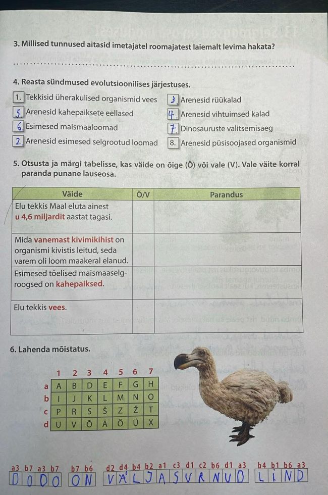 Tutvusime õpiku teemaga "2.10. Selgroogsete põlvnemine" ja õppisime teema läbi Opiq.ee keskkonna, kus Robin lahendas ka vastavad harjutused. Ta sai teada, et organismide tunnused sobivad nende eluviisiga evolutsiooni tõttu ning liigid muutuvad väga pika aja jooksul. Evolutsiooni tõendavad kivistised ning organismide ehituse ja DNA võrdlemine. Elu tekkis vees ja esimesed selgroogsed olid kalad. Vihtuimsetest kaladest arenesid kahepaiksete eellased, kes suutsid elada nii vees kui ka maismaal. Roomajad olid esimesed selgroogsed, kes said täielikult maismaal elada ja paljuneda. Dinosauruste ajastul olid roomajad väga mitmekesised ning lindude sugulust roomajatega näitab ürglind arheopterüks. Hiljem arenesid roomajatest imetajad, kelle eelisteks on püsisoojatus, karvkate, poegade toitmine piimaga ja arenenum aju, mis võimaldas neil levida ka jahedatesse piirkondadesse.