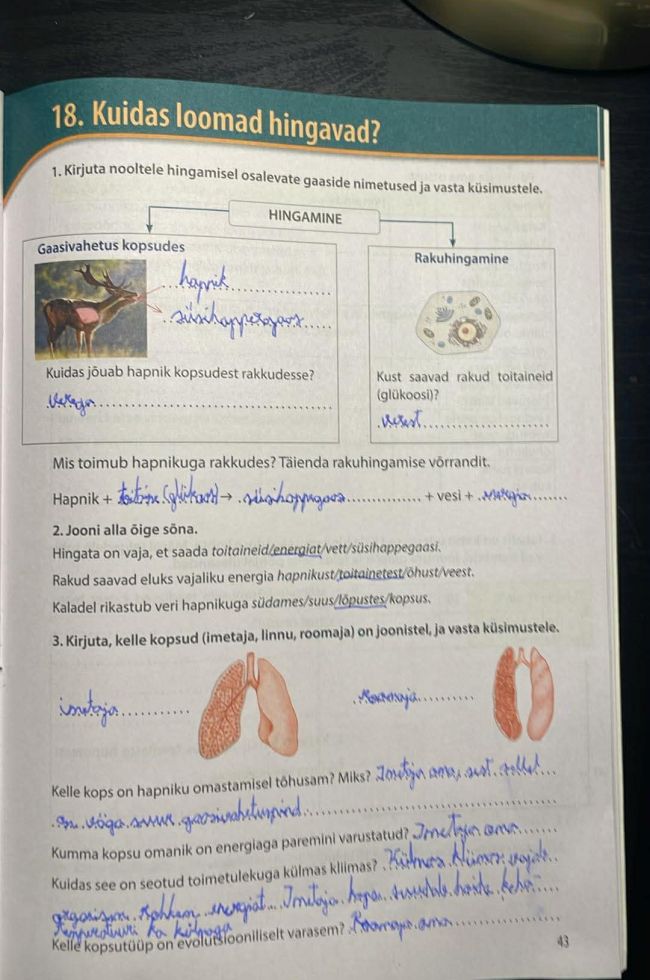 Tutvusime õpiku teemaga „3.3. Kuidas loomad hingavad?“ ja õppisime teema läbi Opiq.ee keskkonna, kus Robin lahendas ka vastavad harjutused. Ta sai teada, et loomad saavad energiat toitaineid hapniku abil lõhustades ning hingamise käigus võetakse sisse hapnik ja eritatakse süsihappegaas. Hingamiselundites toimub gaasivahetus: hapnik liigub verre ja süsihappegaas verest välja. Veeloomad, nagu kalad, hingavad vees lahustunud hapnikku lõpustega, maismaaloomad kopsudega. Kahepaiksed hingavad nii kopsude kui ka niiske naha kaudu, roomajad ainult kopsudega. Lindudel on kopsud ja õhukotid, mis tagavad väga tõhusa hingamise, ning imetajatel koosnevad kopsud paljudest sombukestest, mille arv sõltub looma aktiivsusest.