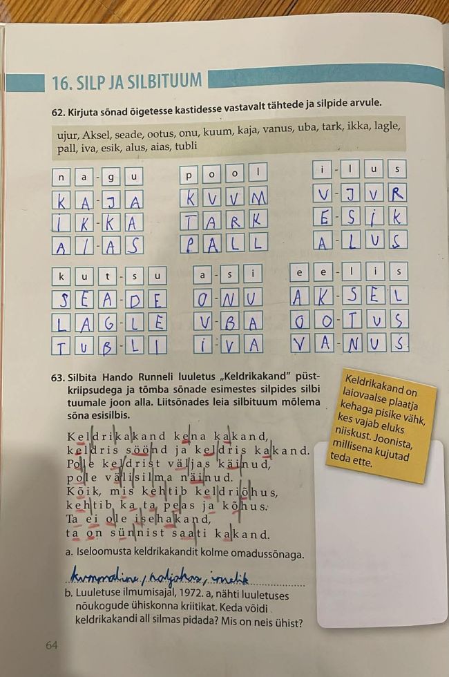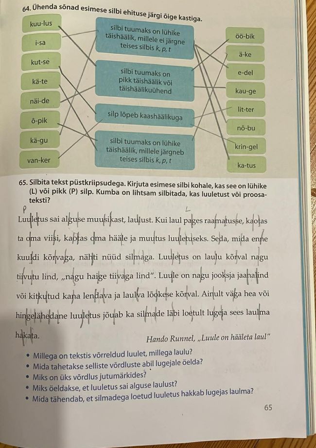 Tutvusime õpiku teemaga „Silp ja silbituum“. Robin sai teada, et igas sõnas peab olema vähemalt üks täishäälik ning täishäälikud koos nendega hääldatavate kaashäälikutega moodustavad silbi. Silbis olev täishäälik või täishäälikuühend on silbituum. Silpe on lühikesi ja pikki – pikk silp tekib näiteks siis, kui silbituumaks on pikk täishäälik või sellele järgneb samas silbis kaashäälik. Sõnu poolitatakse silpide järgi ning ühetähelist silpi ei tohi jätta rea lõppu ega viia üksinda järgmisele reale.