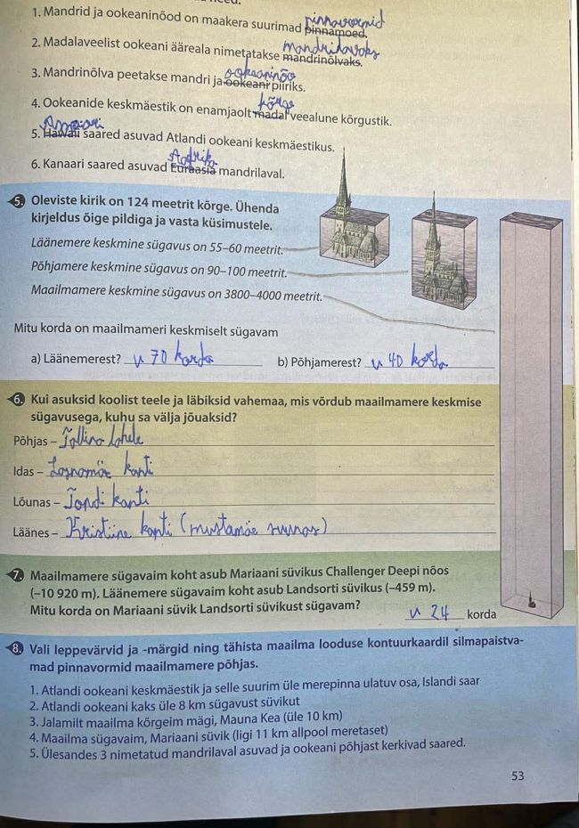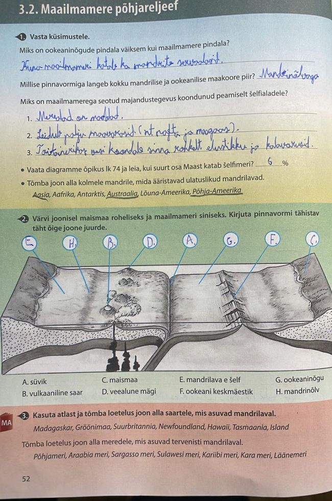Tutvusime Opiq.ee keskkonnas õpiku teemaga "Maailmamere põhjareljeef". Robin sai teada, et maailmamere põhi ei ole ühtlane, vaid koosneb mandrilavadest, mandrinõlvadest, ookeaninõgudest, keskmäestikest ja süvikutest. Ta õppis, et mandrilava on üle ujutatud mandri osa, kus meri on madal ja elustik rikkalik, ning et mandrinõlv tähistab piiri mandrilise ja ookeanilise maakoore vahel. Samuti sai ta teada, et ookeanide põhjas kulgeb üle maailma pikk keskmäestik, esineb palju veealuseid vulkaane ja süvikuid ning maailma sügavaim paik on Mariaani süvik.
