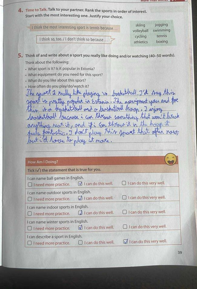 Robin töötas Opiq.ee kaudu peatüki 2.4. Hobbies: Sports iseseisvalt ja tegi mitmeid sealseid harjutusi. Lisaks tv harjutused ja sõnade pähe õppimine, suuliselt vastamine.