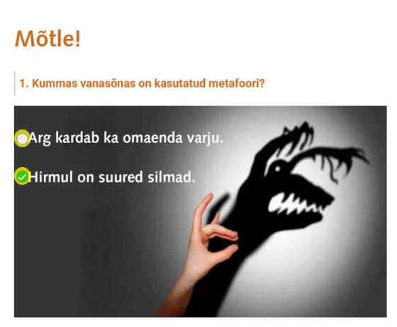 Tutvusime õpiku teemaga „5.6. Metafoor“ ja õppisime teema läbi Opiq.ee keskkonna, kus arutlesime antud teema läbi. Robin lahendas ka vastavad harjutused. Ta sai teada, et metafoor on varjatud võrdlus ehk tähenduse ülekanne, kus ühe asja omadusi kasutatakse teise kirjeldamiseks, et paljud igapäevased väljendid ja kõnekäänud (nt „karuteenet tegema“) põhinevad metafooridel ning et metafoorid aitavad keerulisi mõisteid paremini mõista, seoseid märgata ja mõtteid meelde jätta.